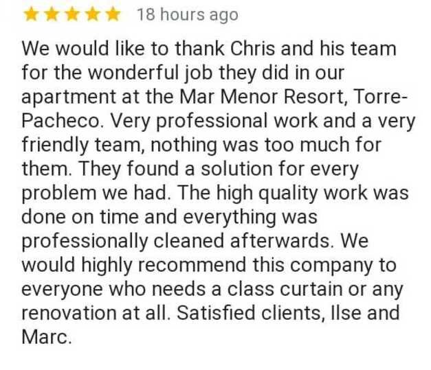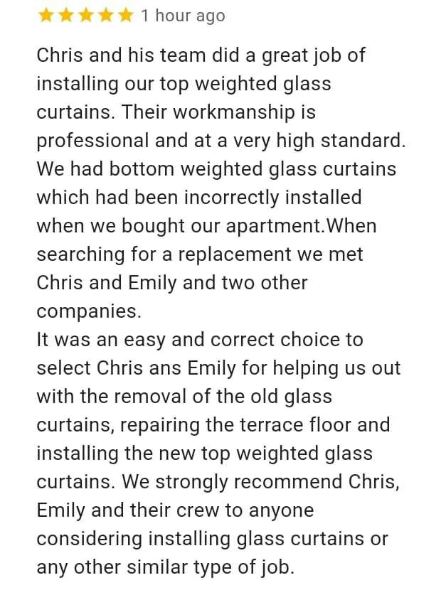 SAVE MONEY ! We offer high quality top or bottom weighted glass curtain systems at the best possible prices. We do not operate from a van, short term rental property or will disappear overnight! Glass Curtains Costa Blanca Murcia have significantly invested in quality owned premises and are the only local company to have a showroom where you can view and discuss our glass curtains first hand. Please feel welcome to visit our office, but we advise that you arrange an appointment in advance to guarantee we will be available onsite to meet you.